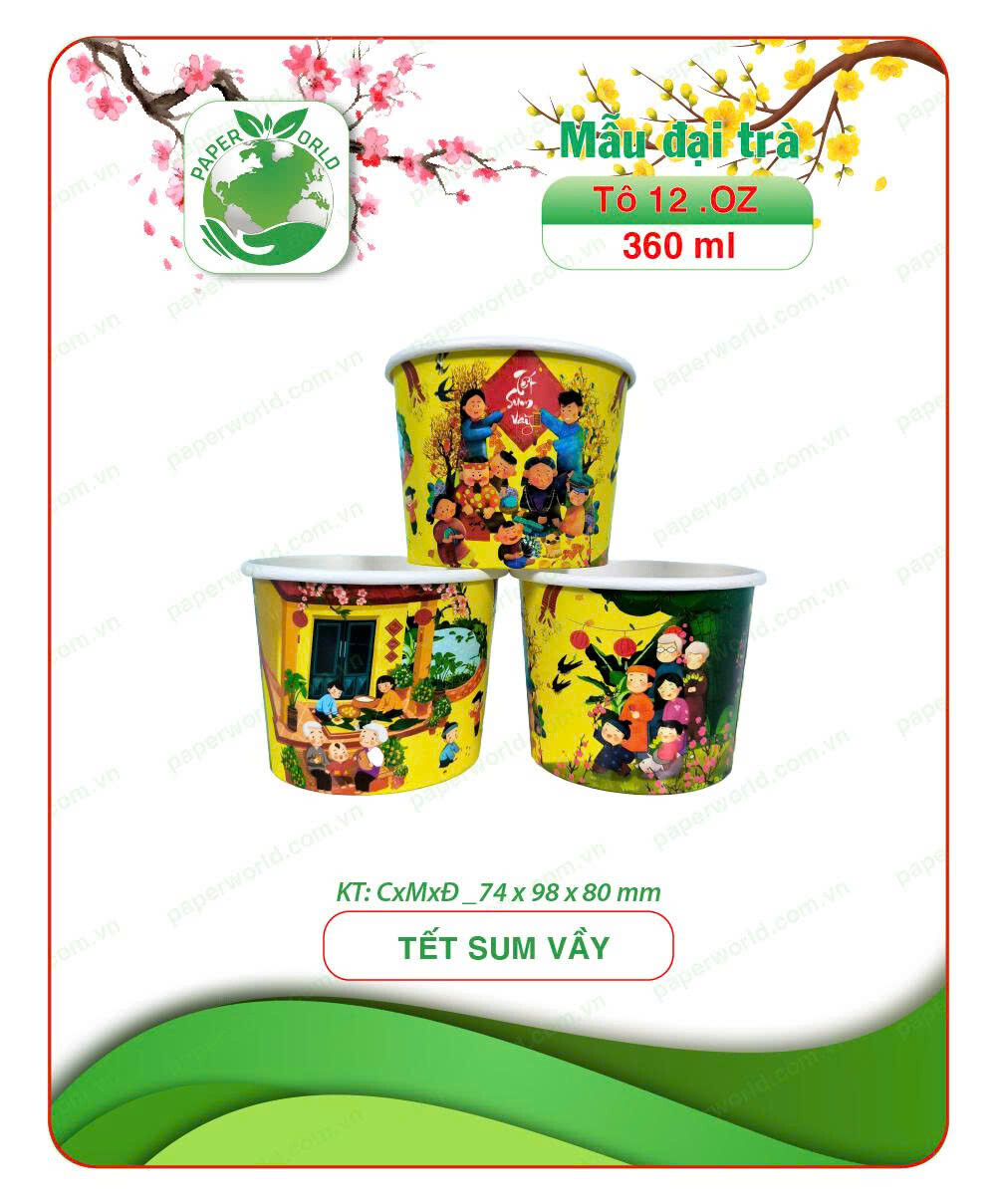 Thiết kế Tết truyền thống với màu sắc rực rỡ, may mắn, minh họa sum vầy đầy cảm xúc. Ly/tô giấy chắc chắn, an toàn thực phẩm, giữ nhiệt tốt – lý tưởng cho mì, canh, lẩu mini hay món mang đi ngày xuân.